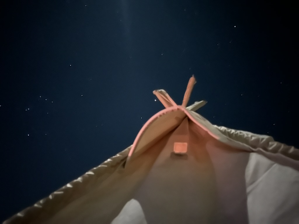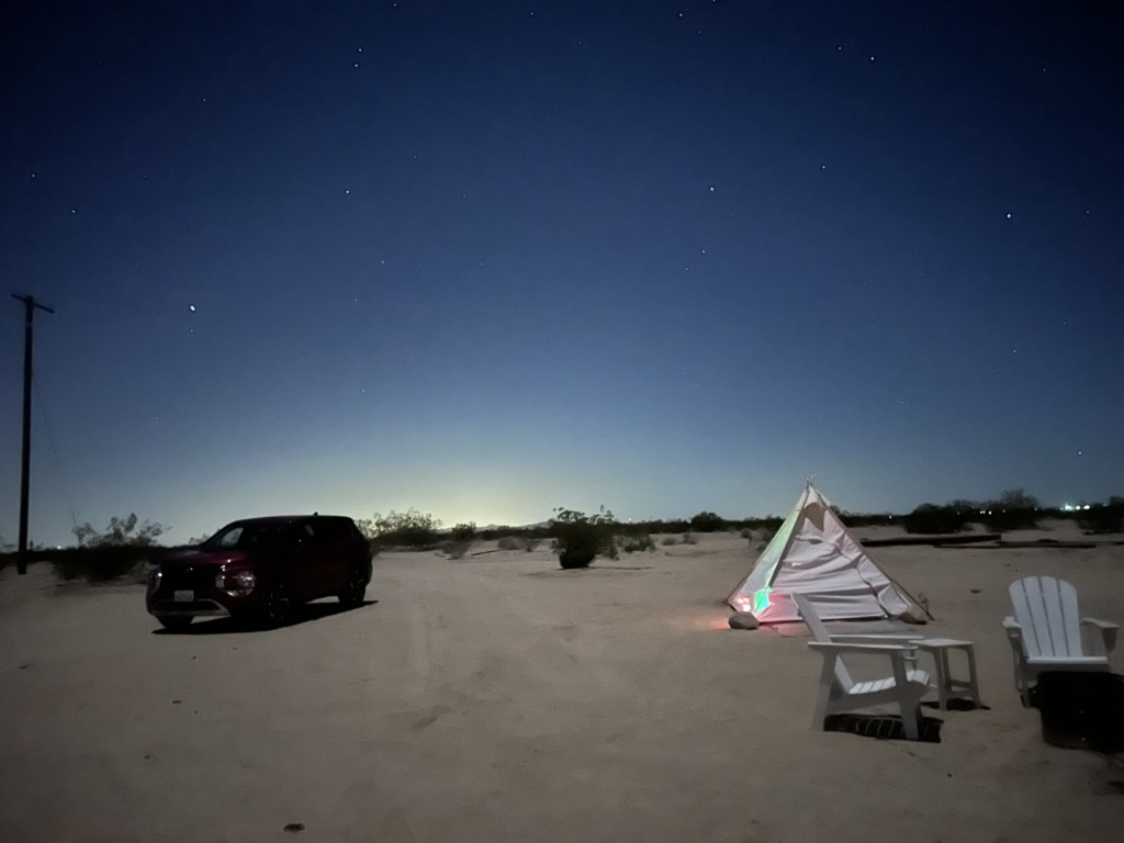Eventually I felt very hungry. I drove back to Twentynine Palms, bought a sandwich from Subway, and returned to my tent. It was early March; the nighttime temperature was around forty degrees Fahrenheit. The Airbnb was a tent set up in someone’s backyard. I slowly drove onto the sandy ground behind the house. It was already fully dark. The stars were bright.