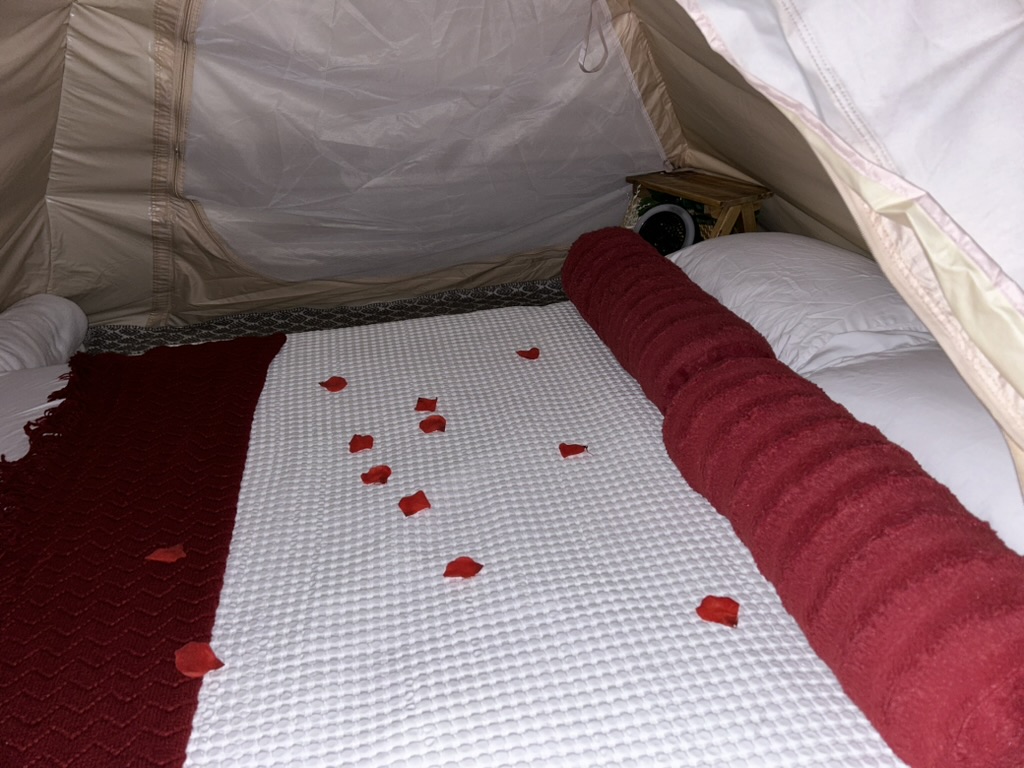 The bathroom was a huge metal barrel with a dry compost toilet inside. The Airbnb was called “Love Nest.” Inside the tent was a comfortable mattress covered with fake rose petals. I carefully gathered the petals and placed them by the bedside.
